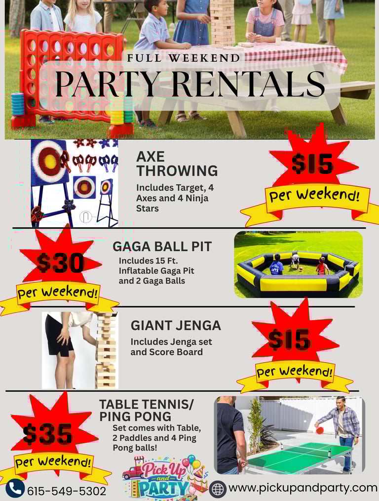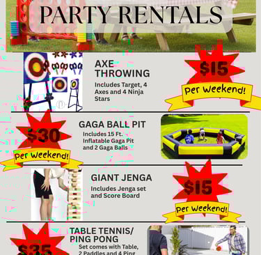 Giants Jenga, Giant Soccer targets and more to keep guests entertained.